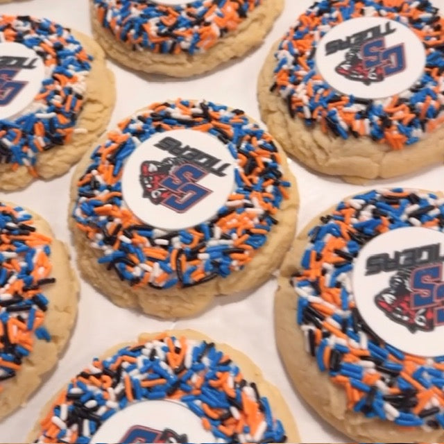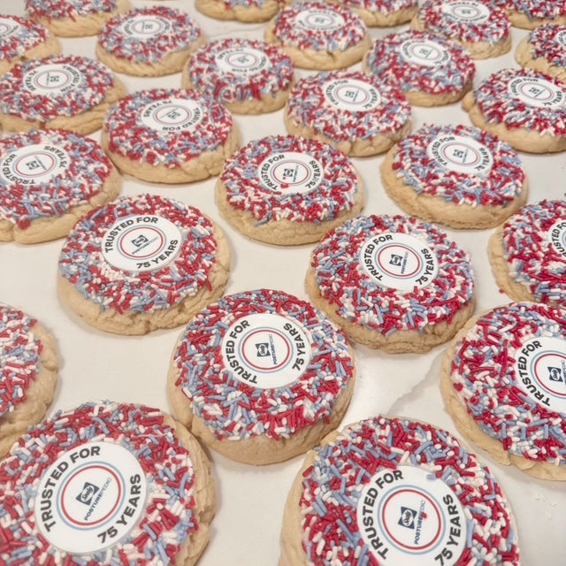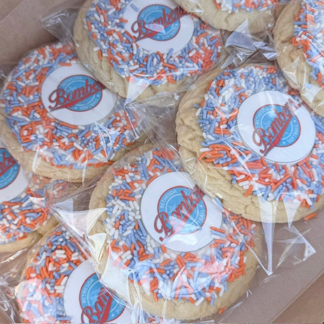Make a lasting impression with these gourmet 6 oz sugar cookies, personalized with your business logo or any high resolution image of your choice. Each cookie is topped with coordinating sprinkles to tie into your brand or party theme. Perfect for marketing, client gifts, corporate events, celebrations, etc. The possibilities are endless. Pick up can be coordinated based on availability.