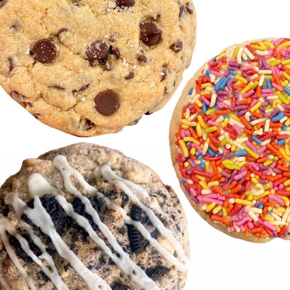 Enjoy three of our best selling cookies packaged in a gift box with bow and complimentary tag option. Flavors include: Chocolate chip, Cookies & cream, and Birthday sprinkle (dye free). A perfect grab and go gift for any occasion! Each cookie is packaged in a heat sealed bag to guarantee freshness.