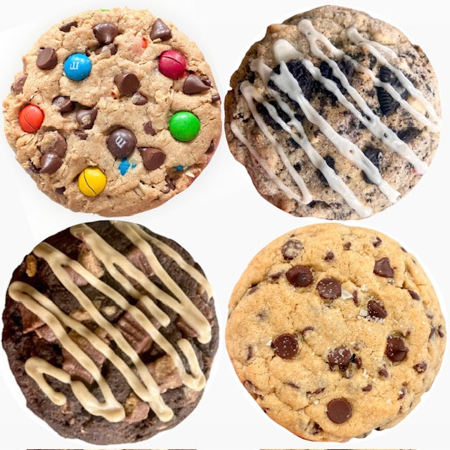 Enjoy four of our chocolate forward cookies packaged in a gift box with bow and complimentary tag option. Cookie flavors include: chocolate chip, chocolate peanut butter cup, classic monster cookie, and cookies n cream. A perfect grab and go gift for any occasion! Each cookie is packaged in a heat sealed bag to guarantee freshness.