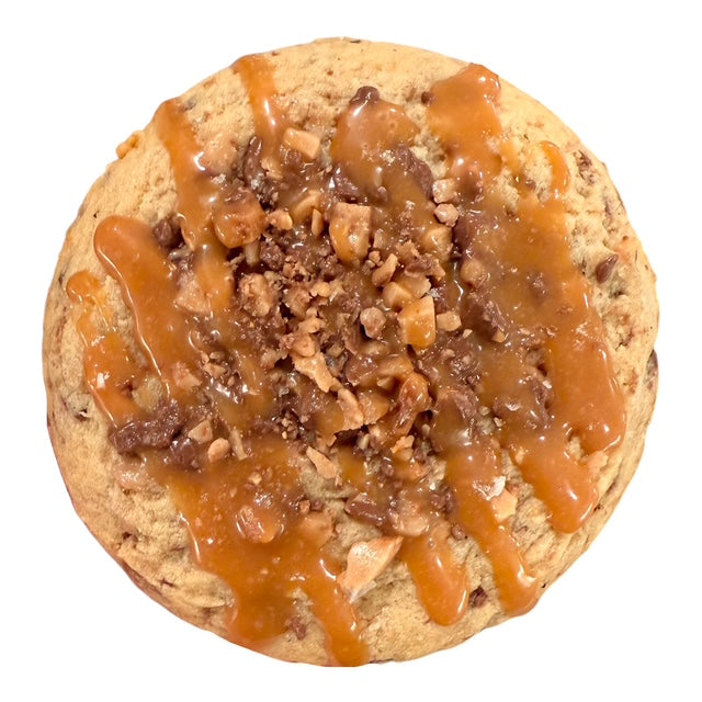 Indulge in the most decedent cookie this holiday season. Perfect for Fall, This large 5.5 oz gourmet cookie is slightly crisp on the outside, soft and chewy on the inside and loaded with heath bar chunks . Topped with toffee bits, a caramel drizzle, and a sprinkle of flakey sea salt, this cookie is the ultimate holiday indulgence.